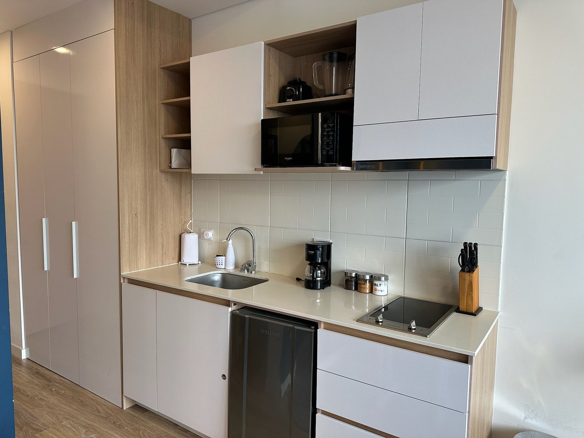 • Ausgestattete Küche: Mini-Küche mit Mixer, Mikrowelle, Kühlschrank, Herd, Kaffeemaschine und Küchenutensilien.