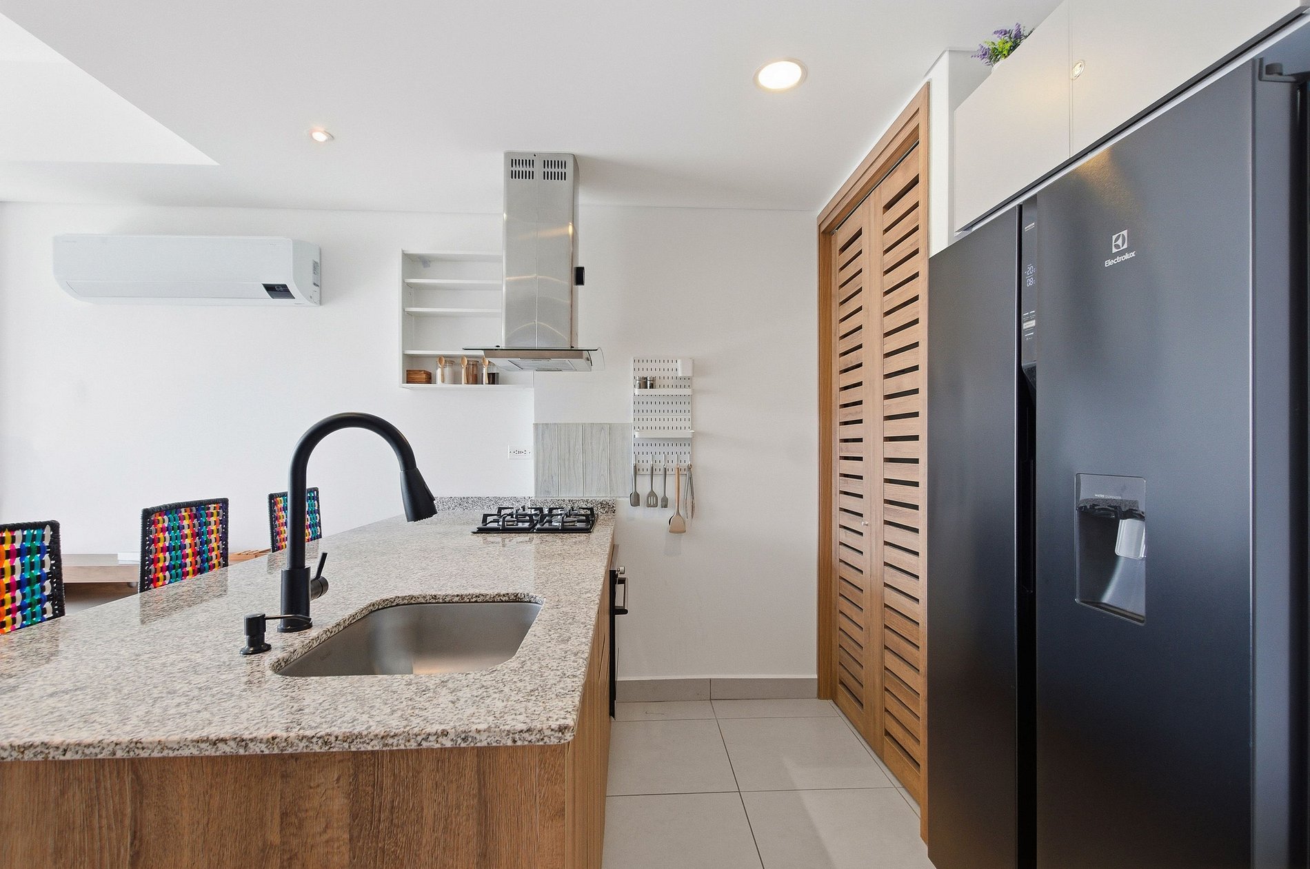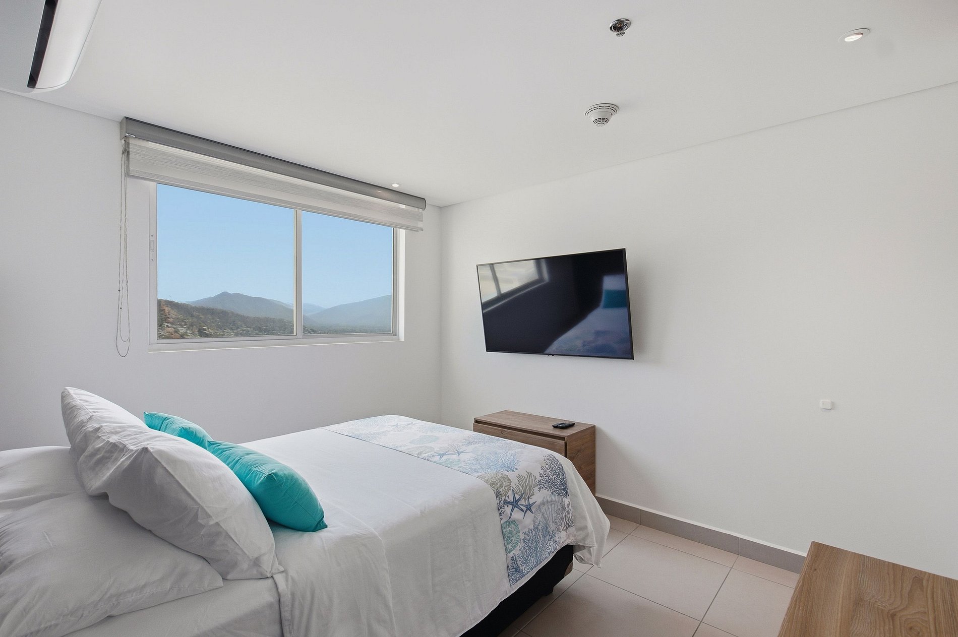 Moderne Wohnung im 14. Stock in Rodadero mit privatem Balkon und Panoramablick auf die Stadt und die Berge. Bietet Komfort, zeitgemäße Einrichtung, ausgestattete Küche, Doppelbett und Einzelbett mit Ausziehbett. Ideal für Paare oder Reisende, die Luxus und Bequemlichkeit in der Ausgehzone suchen, nur wenige Schritte vom Strand und Geschäften entfernt. Genieße Sonnenuntergänge vom Balkon oder entspanne im Pool und den exklusiven Annehmlichkeiten des Gebäudes Ambar Roca.