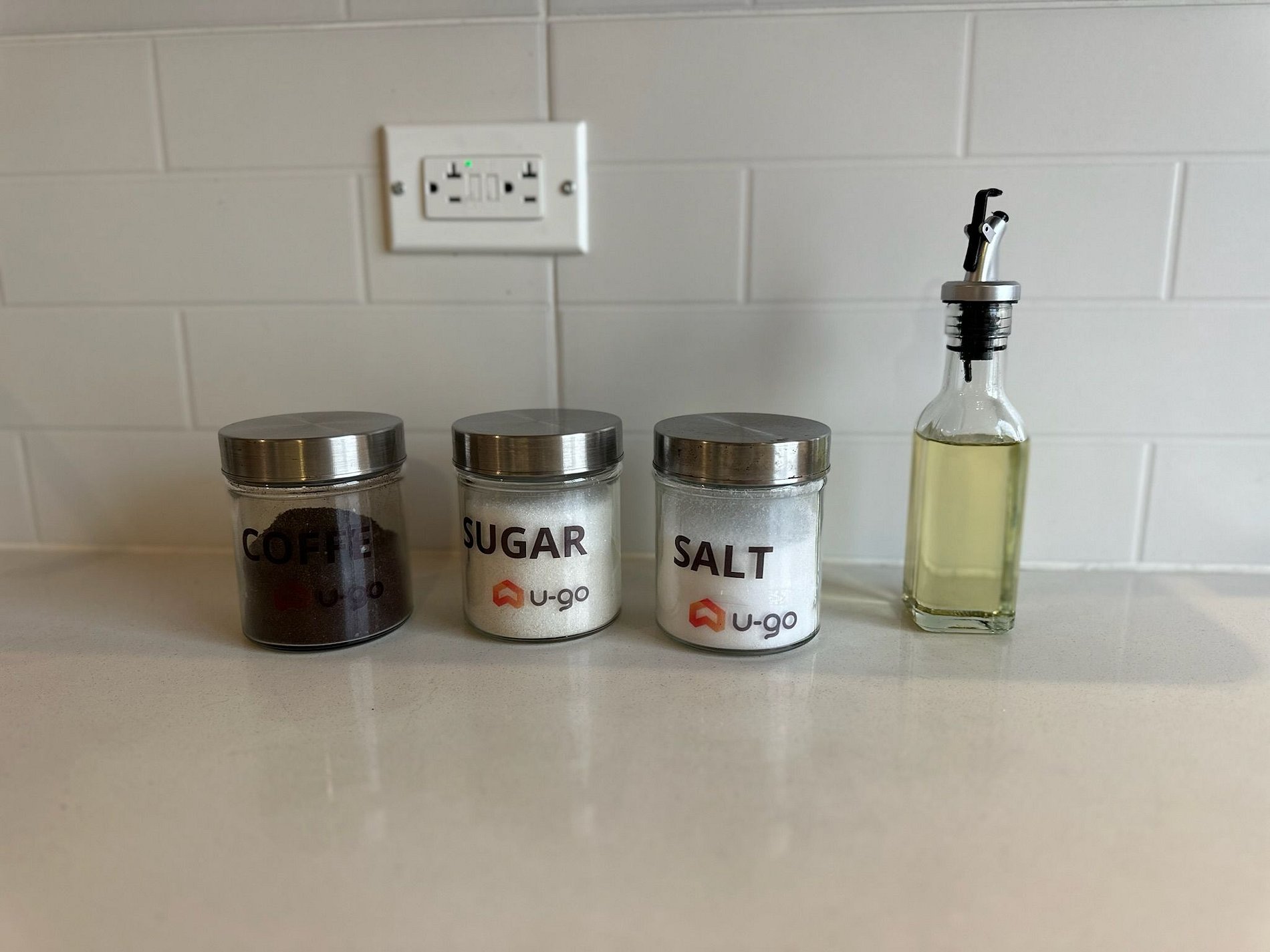 • Komplette Küche: Mini-Küche mit Mixer, Mikrowelle, Kühlschrank, Herd, Kaffeemaschine und Küchenutensilien.