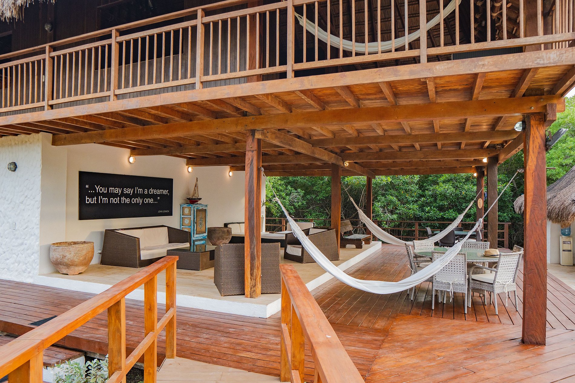 • Living Room: Open space with sofas and hammocks, perfect for relaxing and socializing.