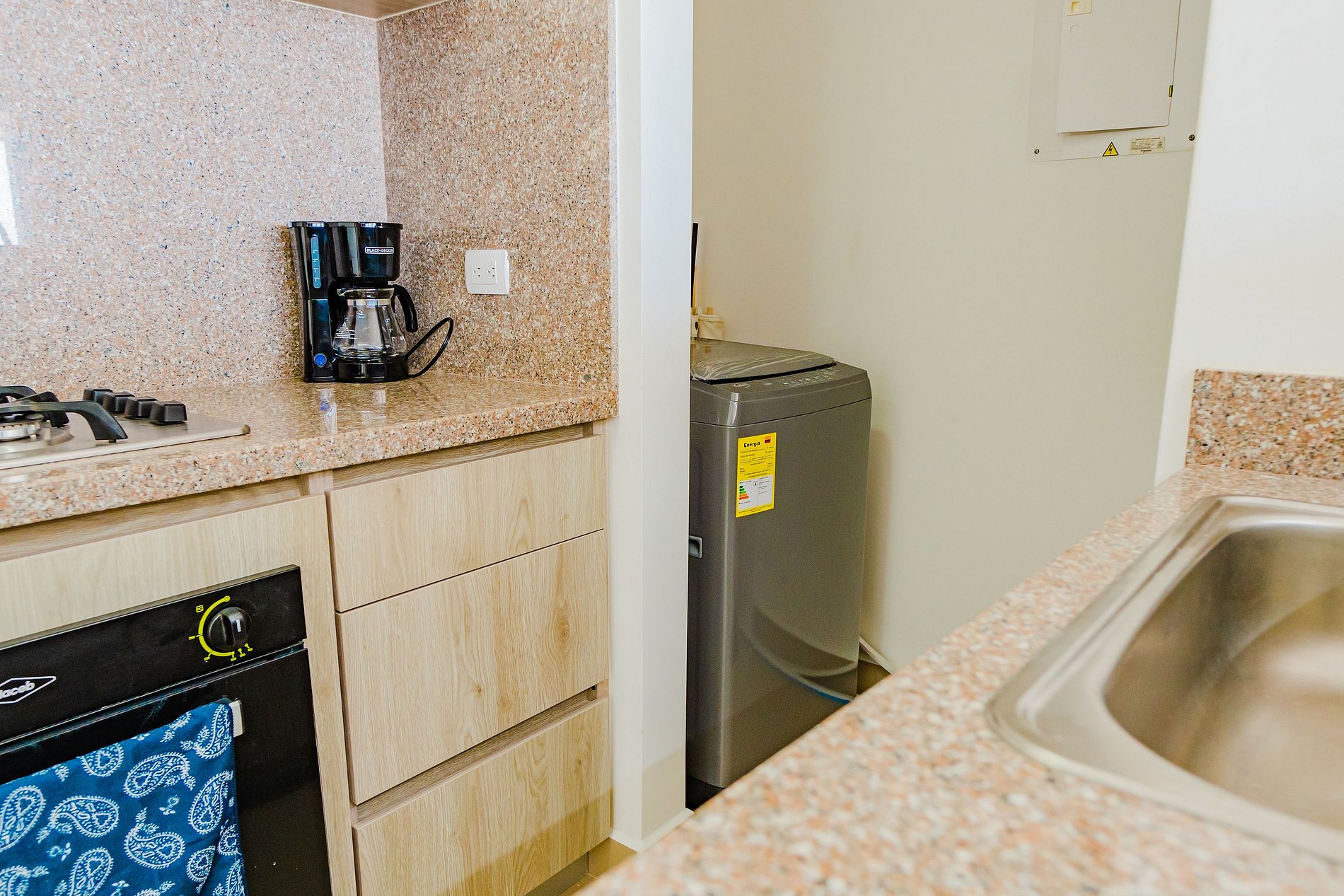 • Kitchen: Equipped with a fridge, stove, oven, coffee maker, and bar.