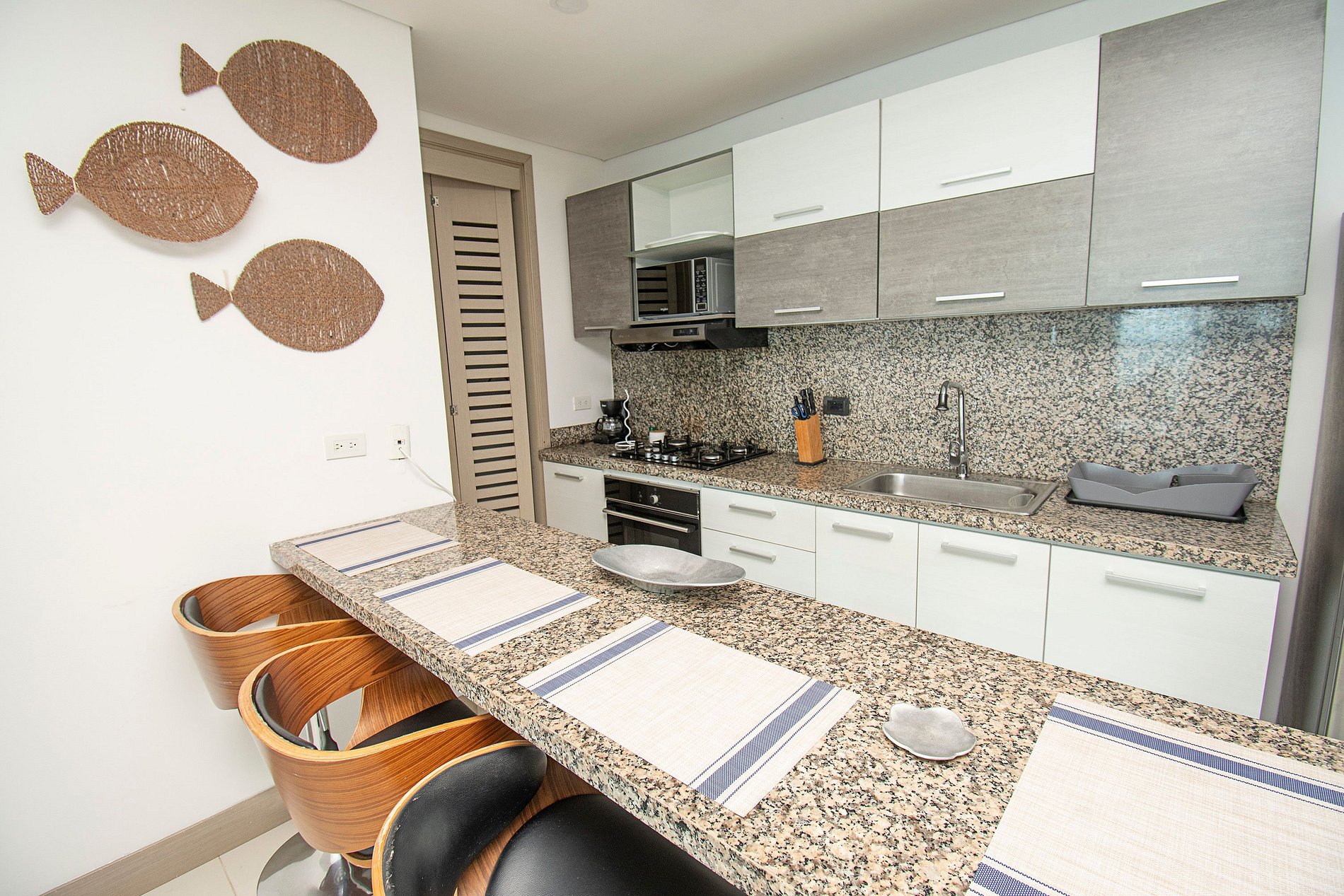 • Kitchen: Equipped with microwave, stove, oven, and coffee maker.
