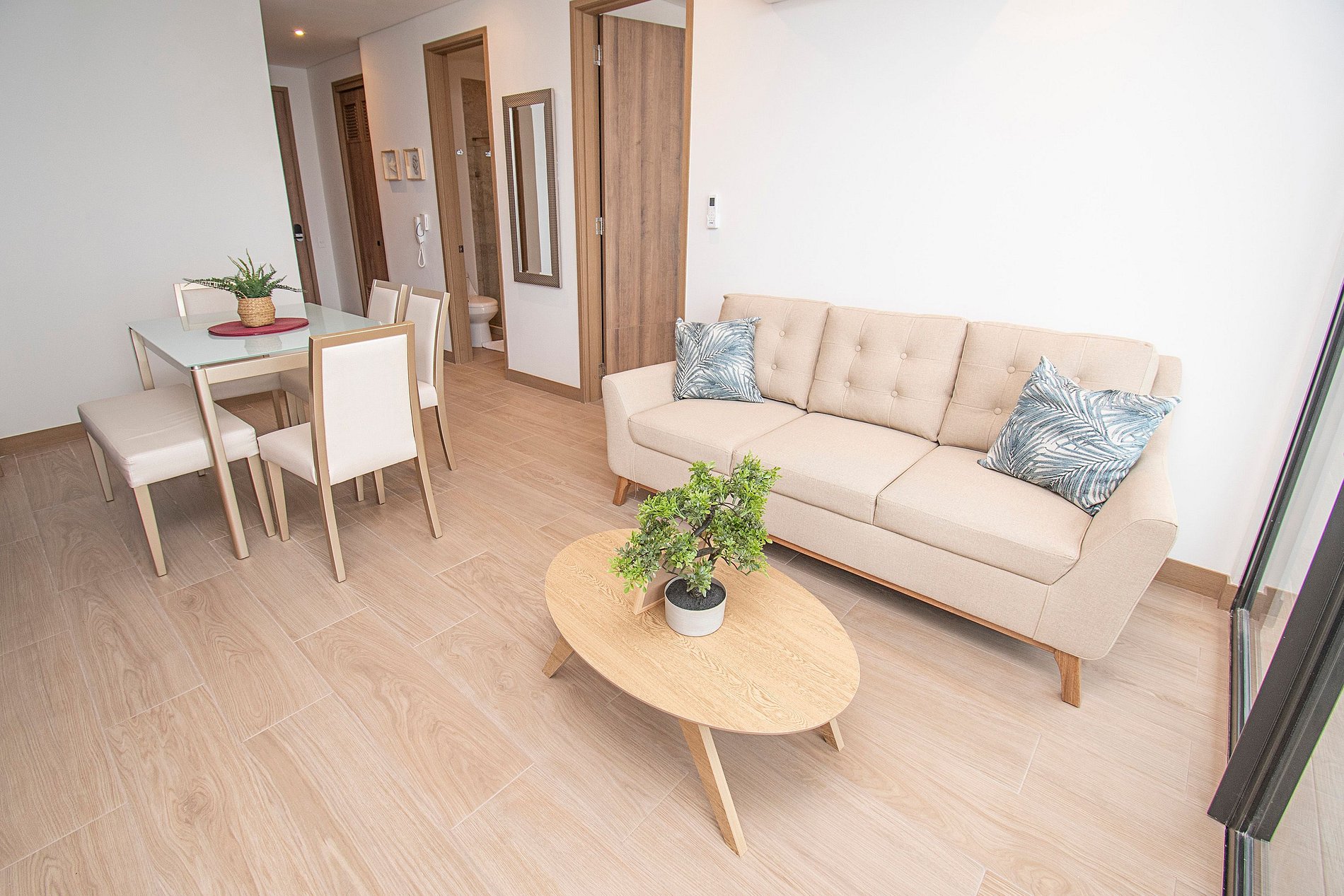 • Living/Dining Room: A cozy space with a comfortable sofa, air conditioning, ideal for relaxing after a day of exploration. The dining area is perfect for enjoying meals with family or friends.