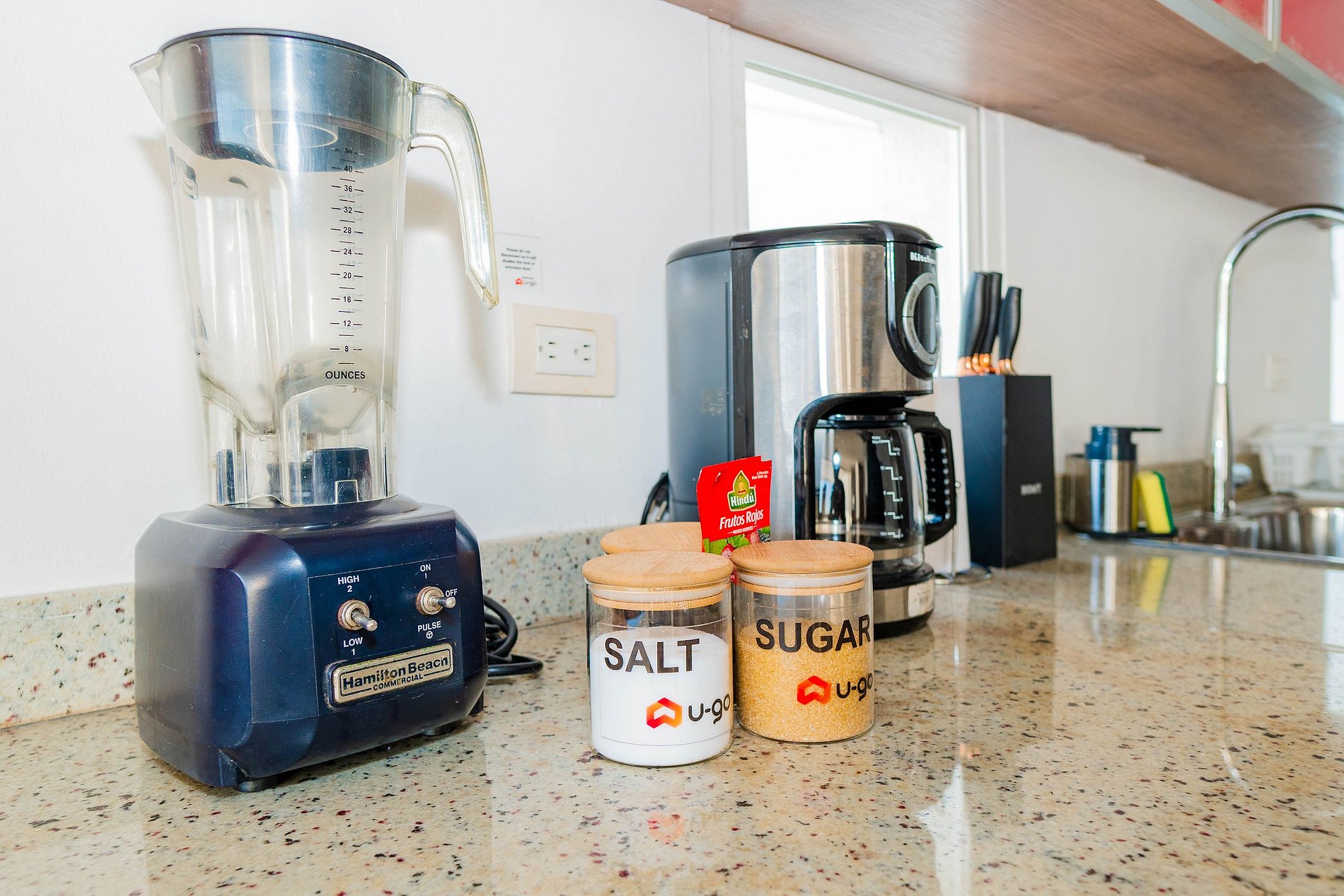 • Kitchen: Equipped with a bar, stove, blender, kitchen utensils, coffee maker, dishes, and cutlery, microwave.