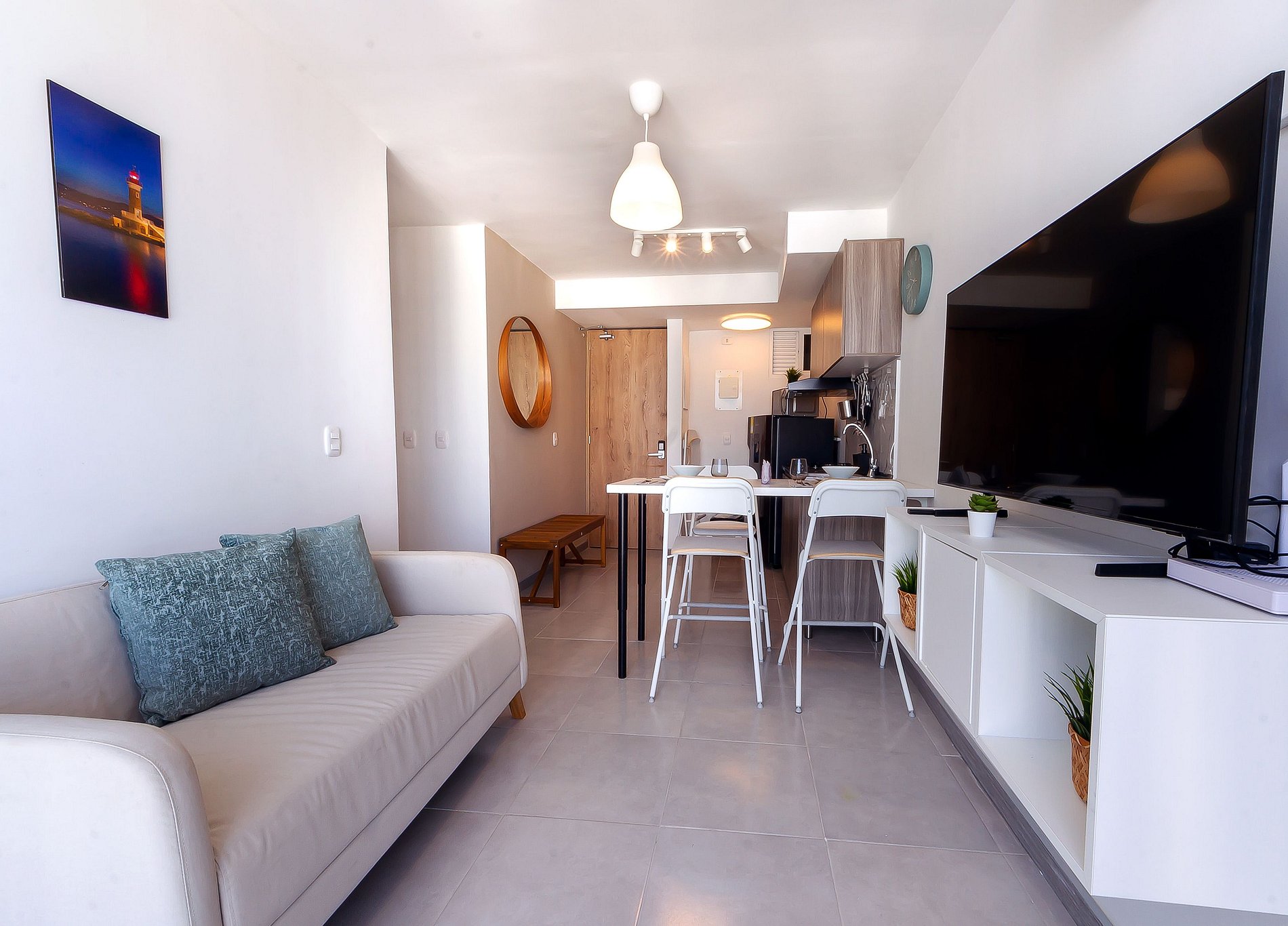 • Sala/Comedor: Espacio integrado con televisor y sala comedor, creando un ambiente moderno y acogedor.