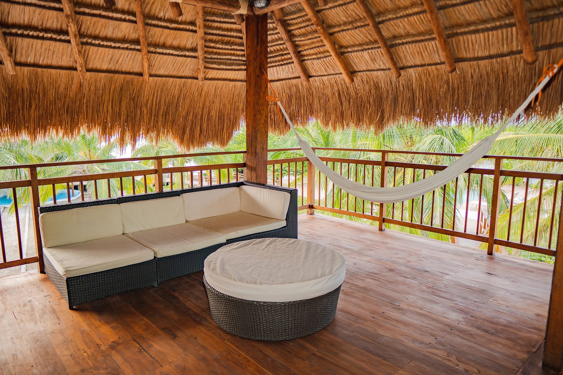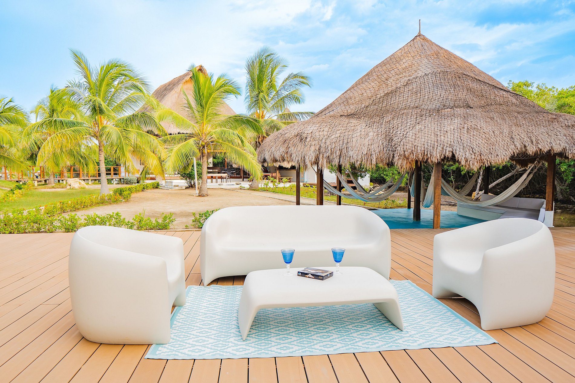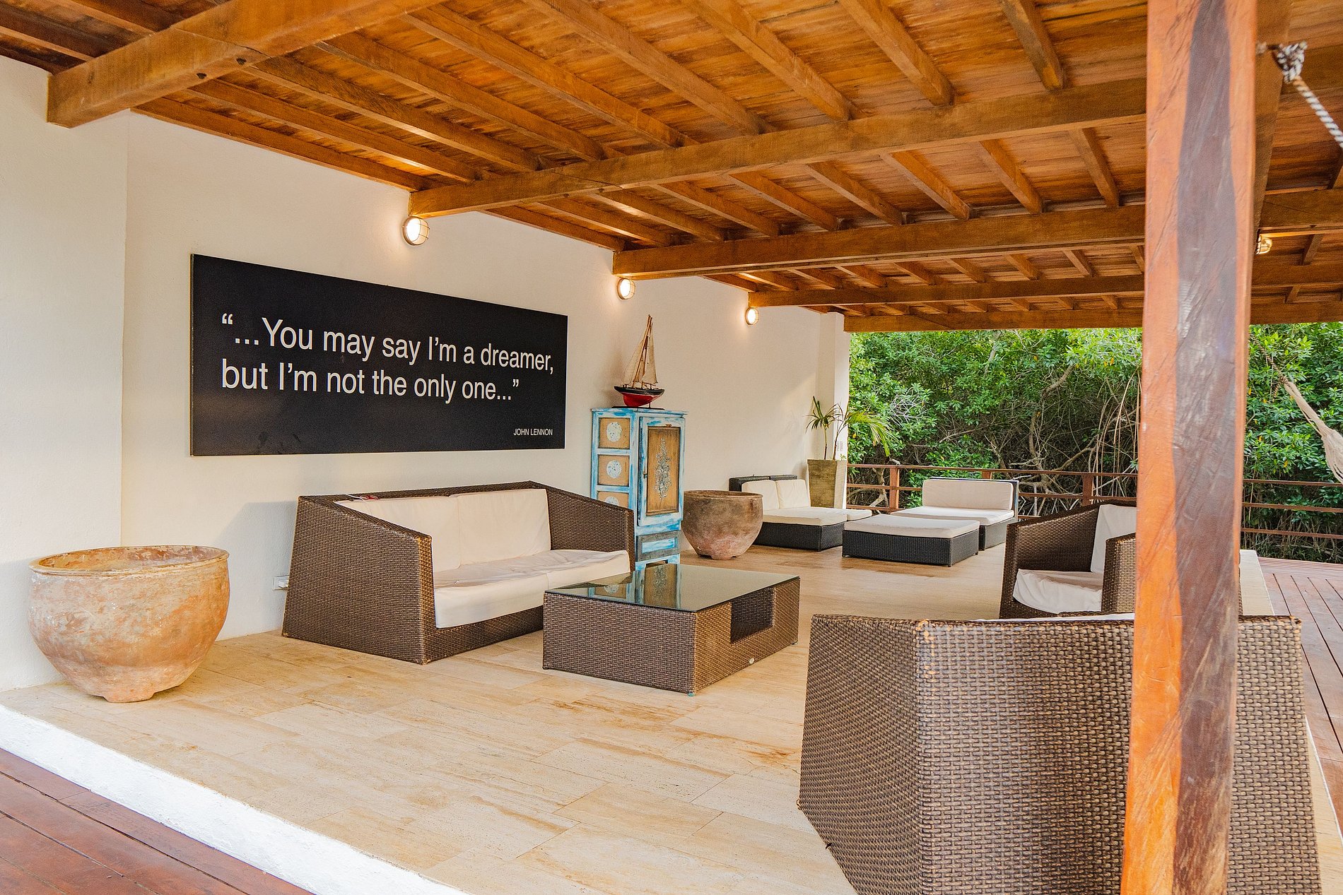 • Sala: Espacio abierto con sillones y hamacas, perfecto para relajarse y socializar.
