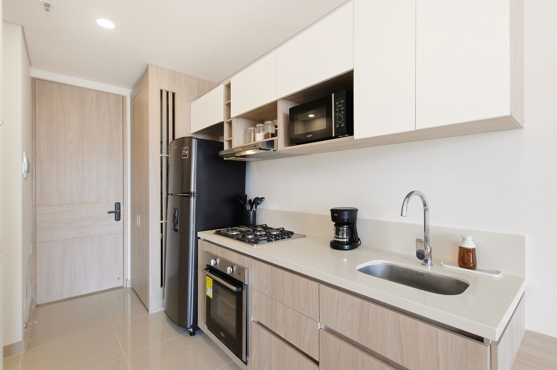 • Cocina: Equipada con cafetera, estufa, licuadora, horno, nevera, sandwichera y utensilios de cocina.