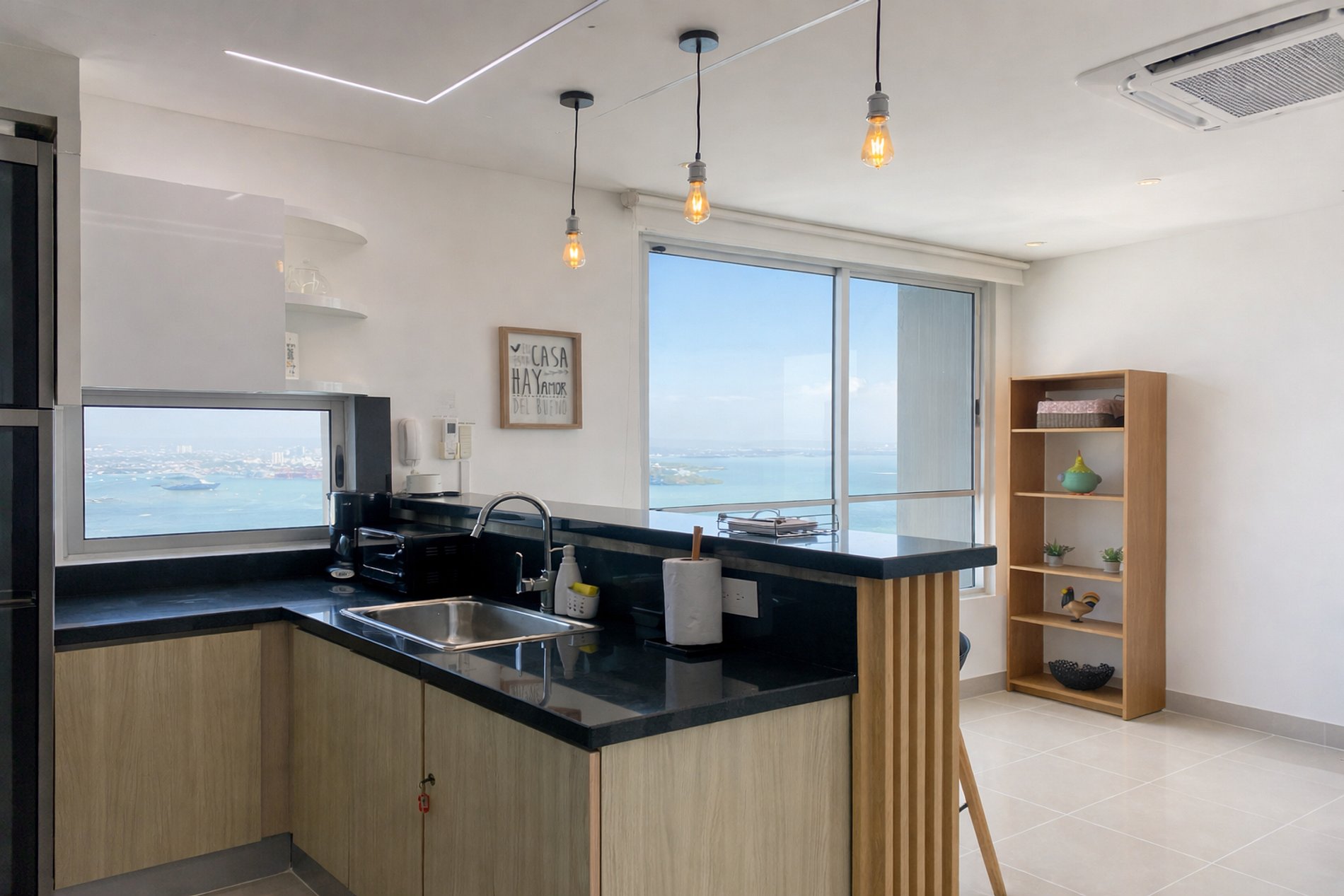 • Cocina: Equipada con nevera, congelador, utensilios de cocina, estufa, horno, cafetera, tostadora, barra, sanduchera y air fryer.