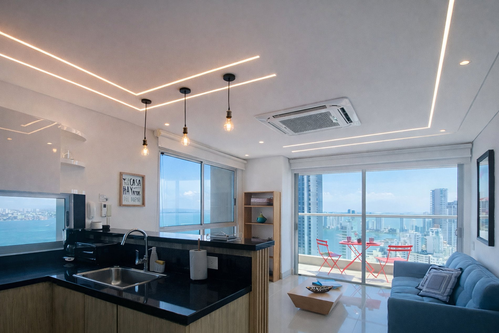• Balcón: Con vista al mar y la ciudad, ideal para relajarse y disfrutar del paisaje.