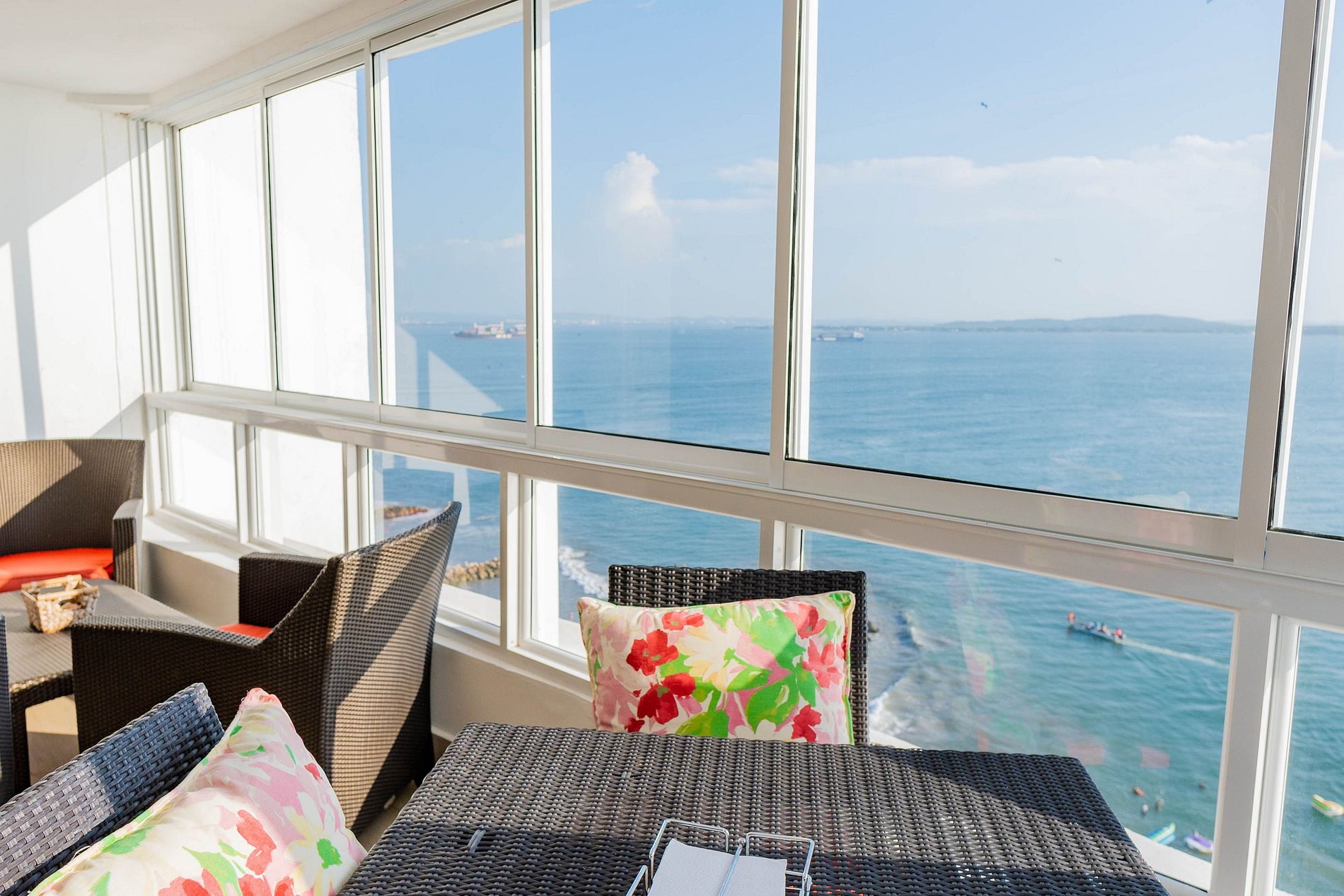 • Sala/Comedor: Espacio integrado con vistas al mar, sofá cómodo y sillones.