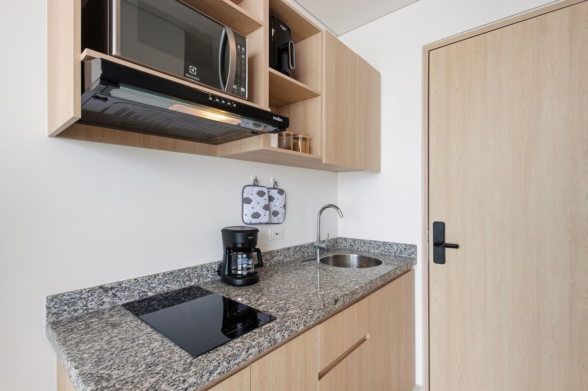 • Cuisine : Équipée d'un micro-ondes, cafetière, cuisinière, mixeur, réfrigérateur, appareil à sandwichs et ustensiles de cuisine.